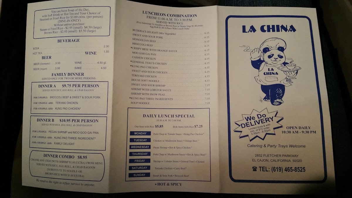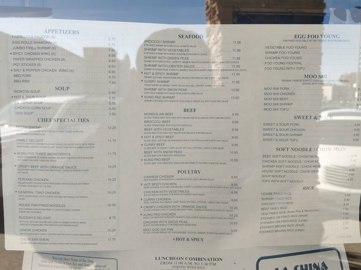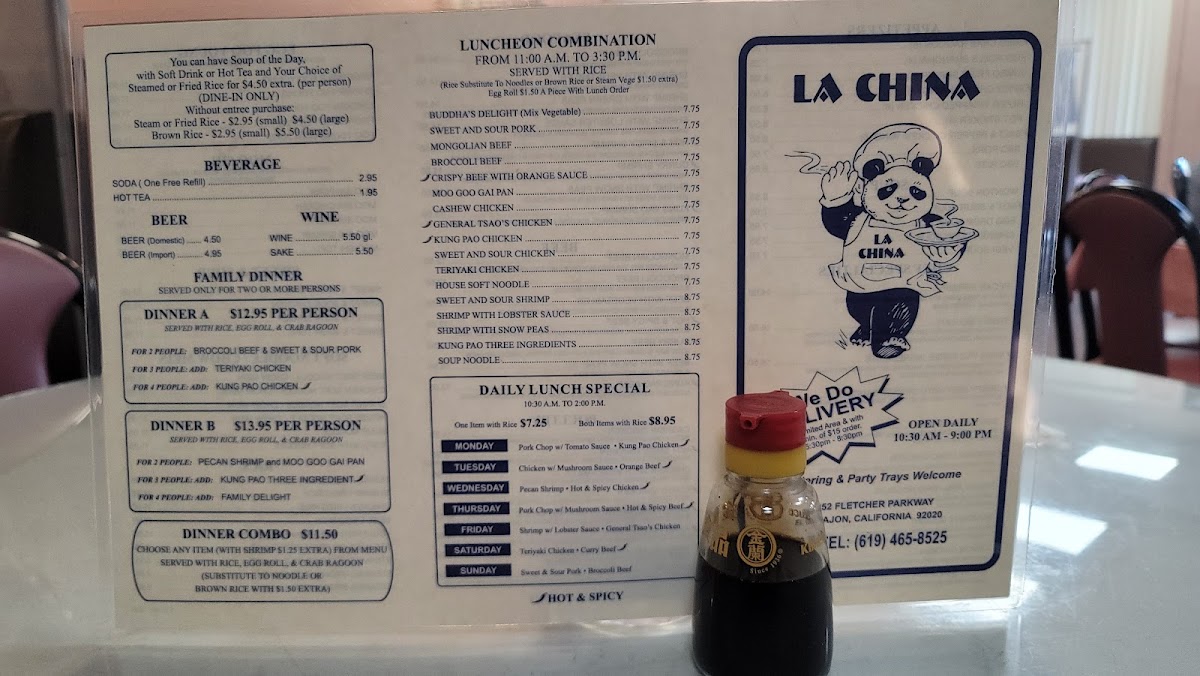 Welcome to La China Restaurant, a cozy gem located at 2852 Fletcher Pkwy, El Cajon, CA. This family-run establishment has been delighting patrons for over 15 years with its hearty and flavorful dishes. The menu offers a wide array of options, from savory soups like Wonton Soup and Chicken Corn Soup to the beloved Sweet and Sour selections, including pork, chicken, shrimp, and even tofu, all priced around $15.