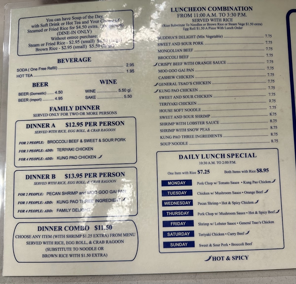 $17 per person. Served with rice, egg roll, and crab ragoon. For 2 people: pecan shrimp and moo goo gai pan. For 3 people: add kung pao 3 ingredient (hot and spicy). For 4 people: add family delight.